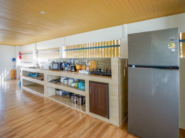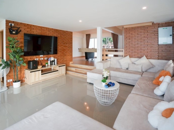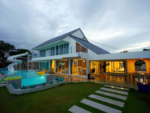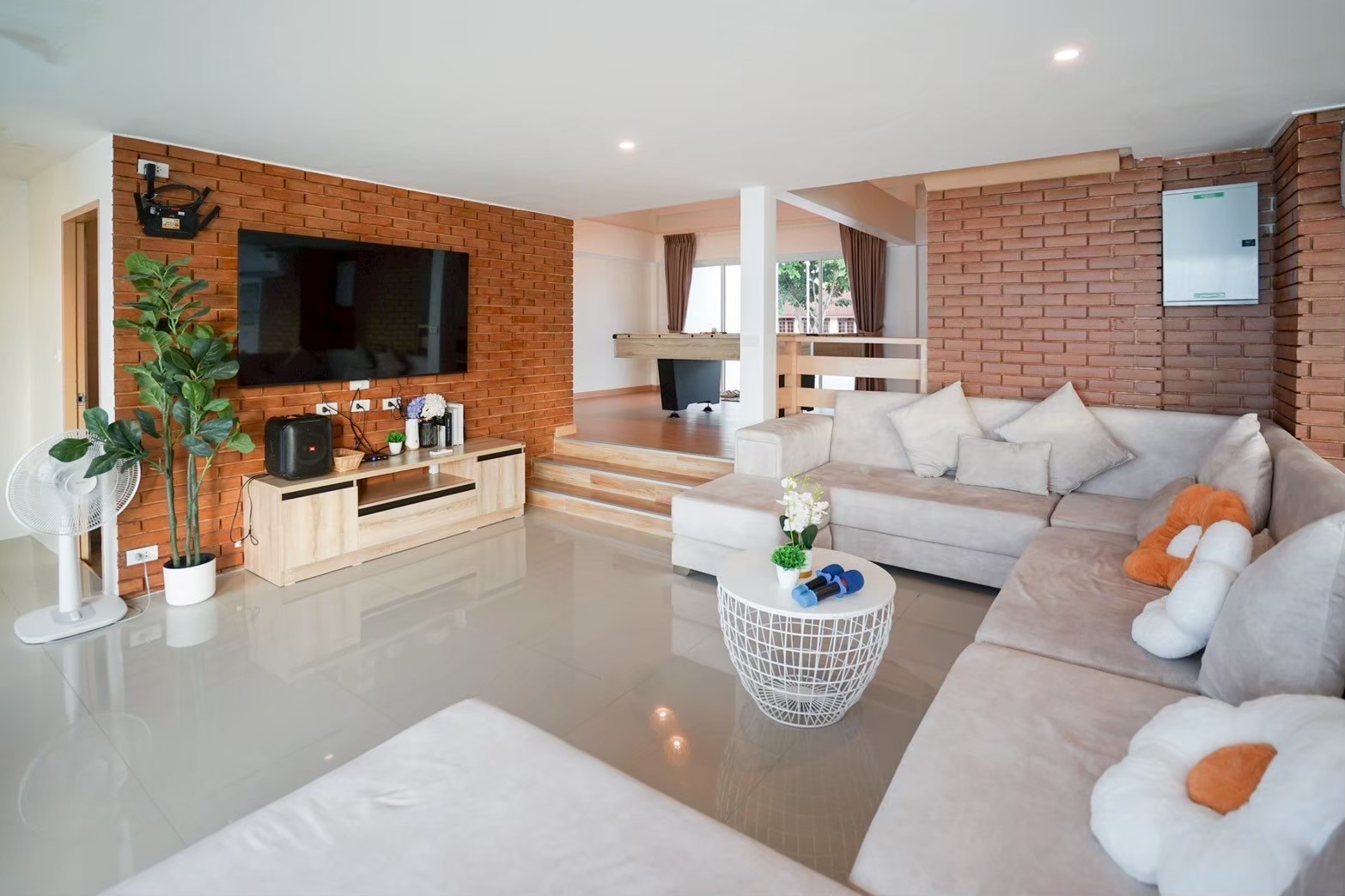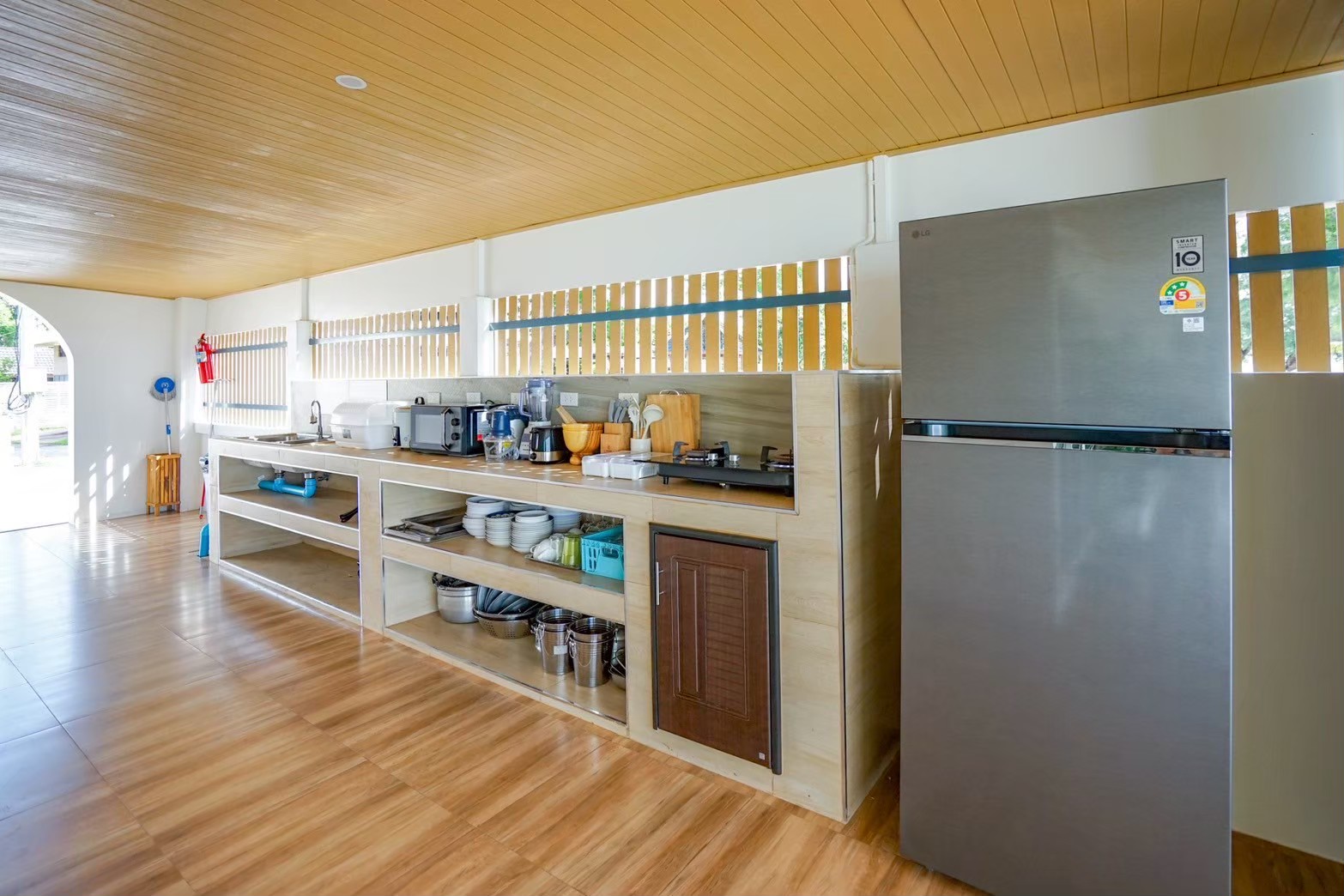 บ้านพักมีสนามหญ้า และมีโซนปาร์ตี้หน้าบ้าน มีโต๊ะทานอาหาร พร้อมเตาปิ้งย่าง